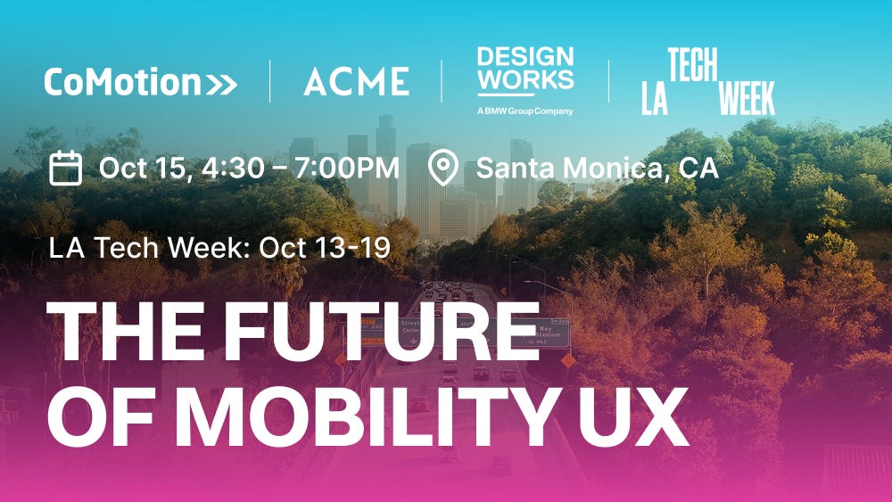 - CoMotion LA Salon at LA Tech Week: ‘The Future of Mobility UX’ on Oct 15 to discuss the future of the mobility experience and LA's unique opportunities. Co-hosted by CoMotion and BMW Designworks.
